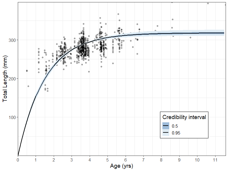 Additional BayesGrowth functions are available that help the user manipulate the returned Estimate_MCMC_Growth object. The Calculate_MCMC_growth_curve function will provide confidence intervals around the growth curve based on MCMC parameter percentiles. This is essentially a wrapper around the tidybayes::mean_qi() function which means it can be passed straight into a ggplot with the tidybayes::geom_line_ribbon function.