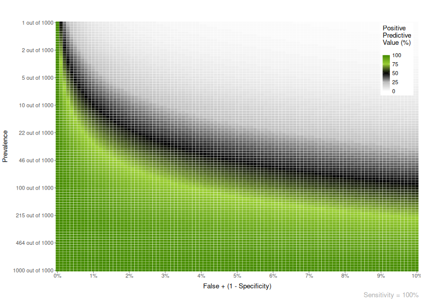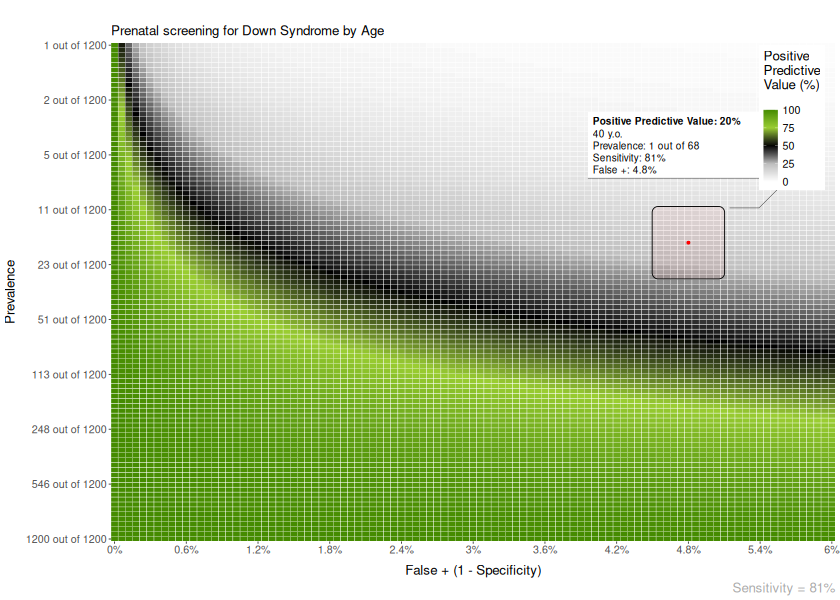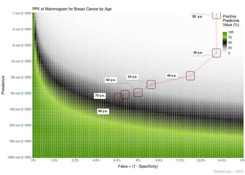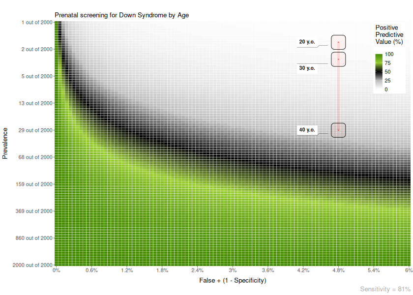Also, you can add a line overlay highlighting a range of prevalences and FP. This is useful, for example, to show how the PPV of a test changes with age: