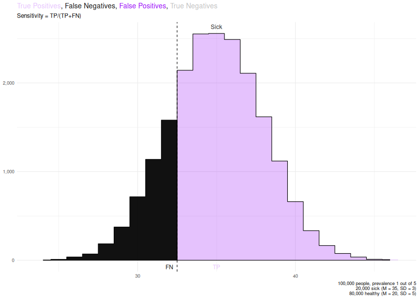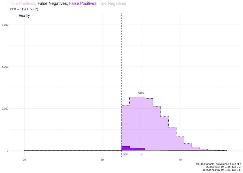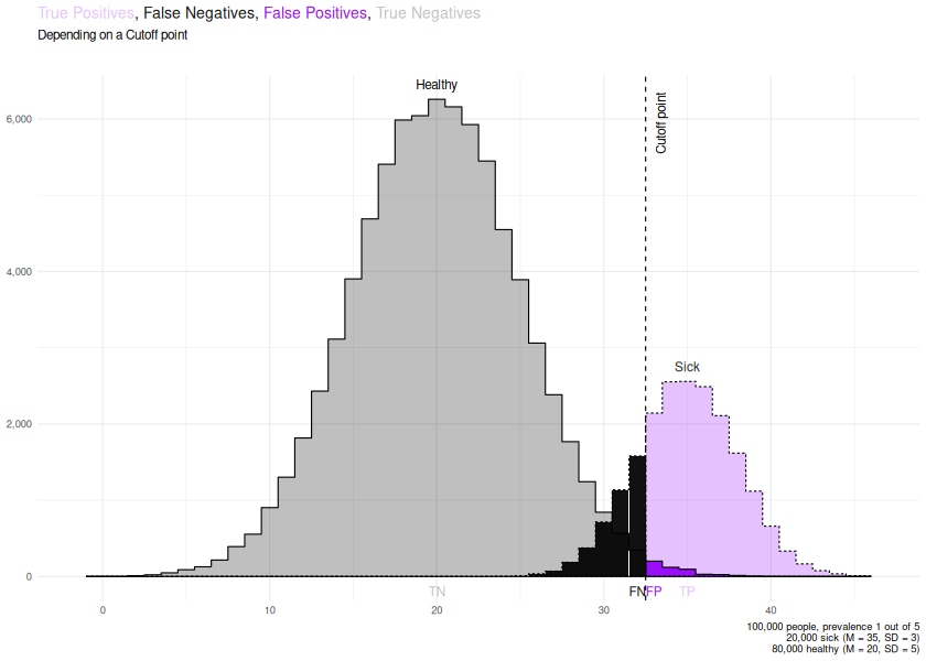 Since v0.4.2 you can also plot the distributions of sick and healthy individuals and learn about how a cutoff point changes the True Positives, False Positives, True Negatives, False Negatives, Sensitivity, Specificity, PPV and NPV.