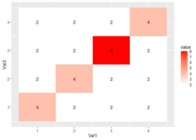 CGGPplotheat is similar to CGGPplotblocks and can be easier to read since it is only a single plot. The \((i,j)\) entry shows the maximum value for which a block was selected with \(X_i\) and \(X_j\) at least that large. The diagonal entries, \((i, i)\), show the maximum depth for \(X_i\). A diagonal entry must be at least as large as any entry in its column or row. This plot is also symmetric.