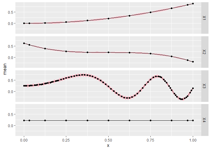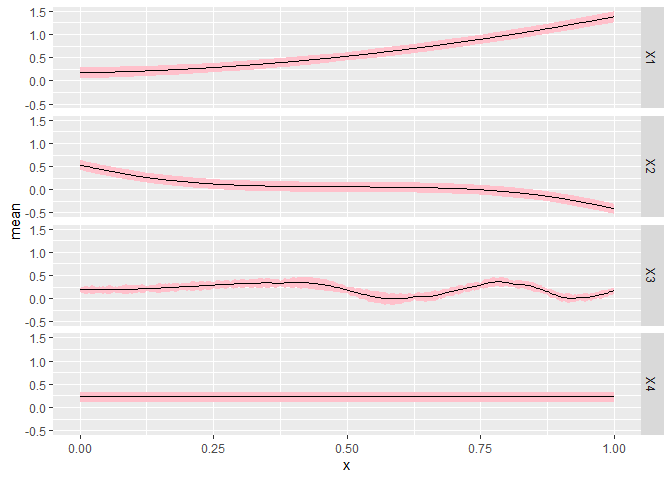 CGGPplotslice shows what the predicted model along each individual dimension when the other input dimensions are held constant, i.e., a slice along a single dimension. By default the slice is done holding all other inputs at 0.5, but this can be changed by changing the argument proj. The black dots are the data points that are in that slice If you change proj to have values not equal to 0.5, you probably won’t see any black dots. The pink regions are the 95% prediction intervals.