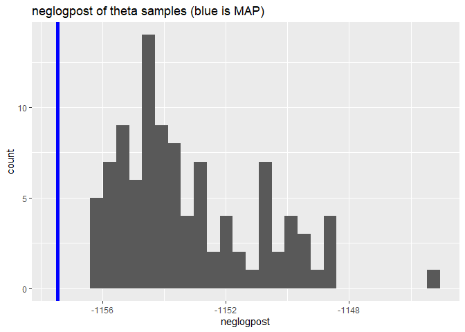 CGGPplotsamplesneglogpost shows the negative log posterior for each of the different samples for theta. The value for the MAP is shown as a blue line. It should be at the far left edge if it is the true MAP.