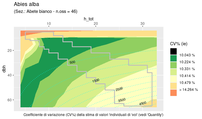 The functions estimating tree volume and aboveground (ABG) phytomass for the 2nd Italian National Forest Inventory (2005) are documented in Tabacchi et al. (2011). (The section of the the publication exposing “Methods and results global evaluation” is accessible here) Regression models have been developed based on sample trees collected within three successive projects, in order to consider, as much as possible, all of the most relevant tree species present in Italian forests.
