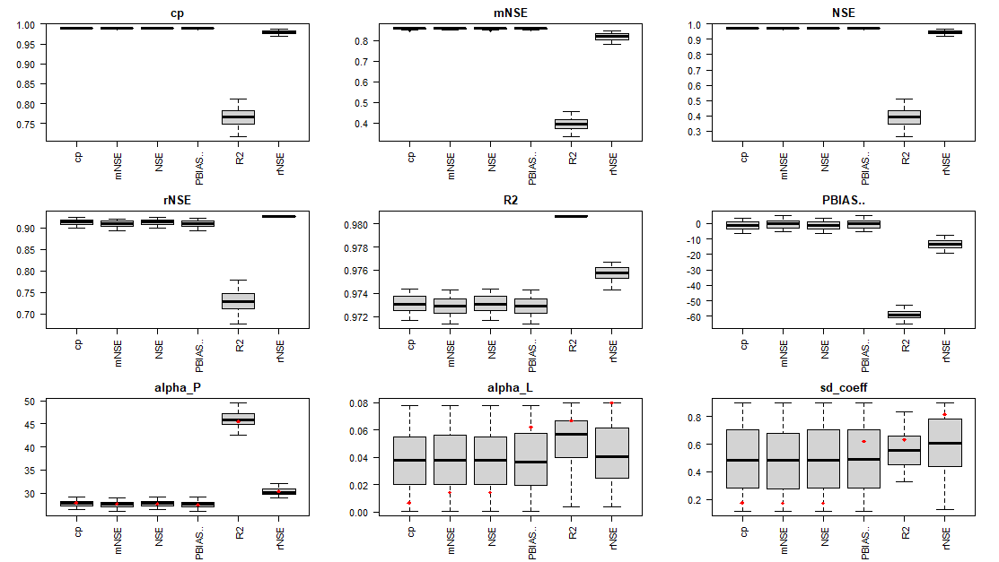 Choosing the right goodness-of-fit metric to select the best set of parameters for a model largely depends on the overall study scope, the area of interest (e.g. high or low load, upper or lower catchment area), and the available observation dataset (size and quality). The library includes a series of functions to examine the calibration results and help select the most suitable set of parameters.