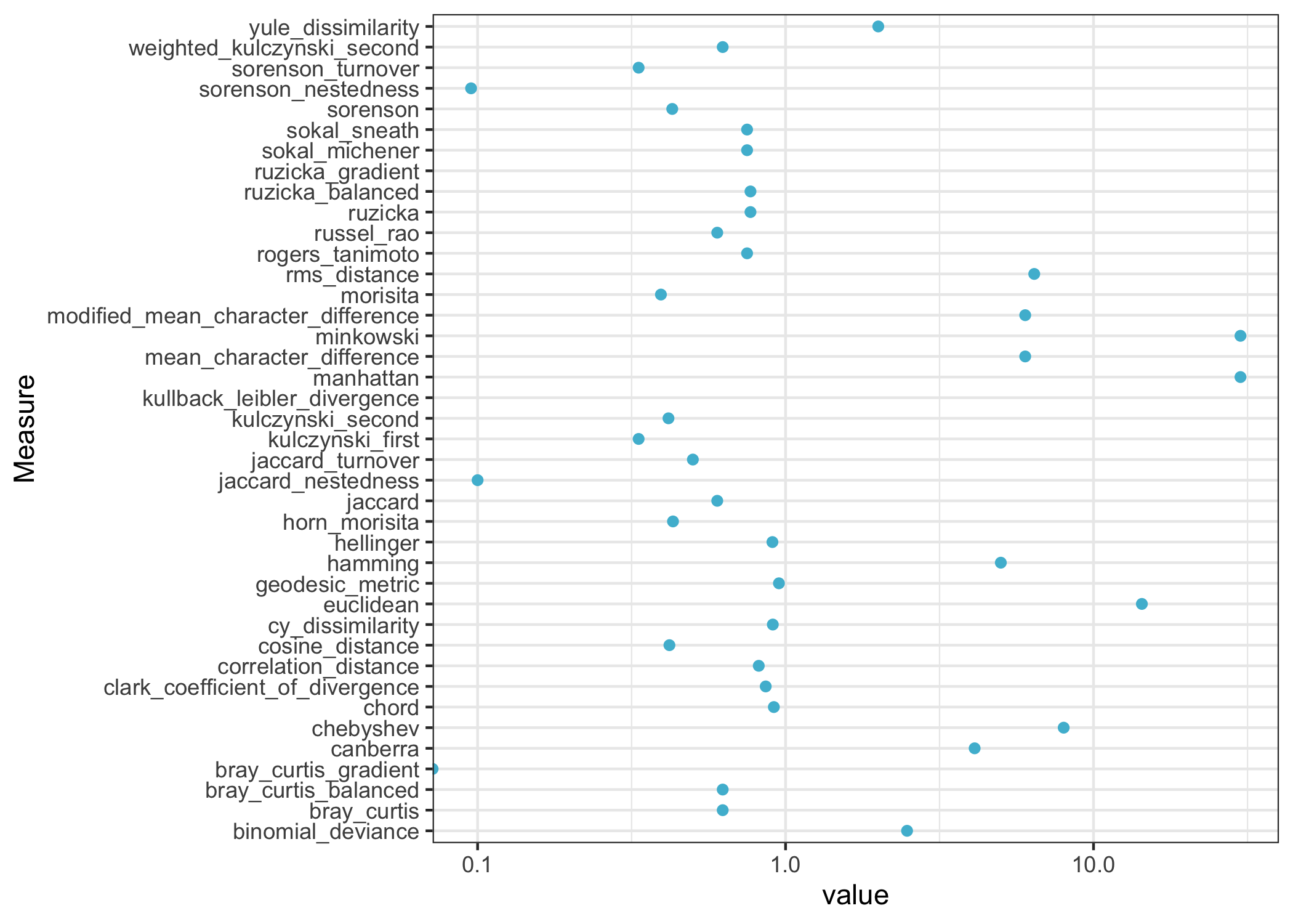 Again, we’ll use a vector called beta_diversities to compute every dissimilarity measure in the library.