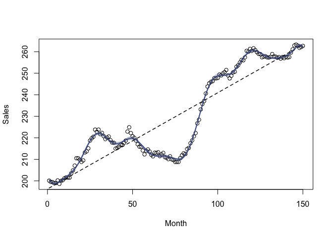 lines(x, fitted(lm(y ~ x)), lty = "dashed", lwd = 1.5)