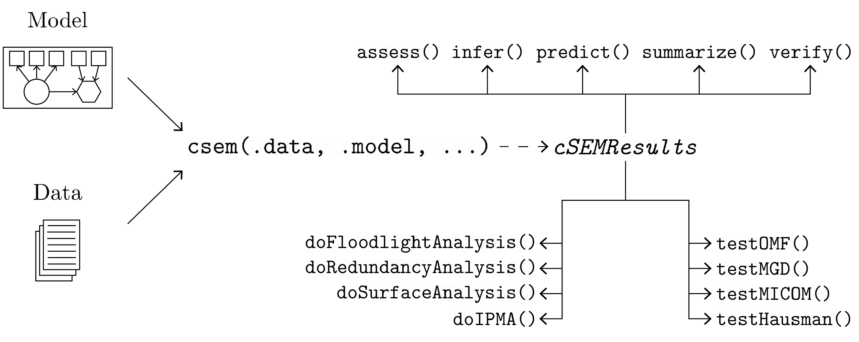 (e.g., standard errors, confidence intervals)predict() : predict endogenous indicator valuesplot() : Plot the cSEM modelsummarize() : summarize the resultsverify() : verify admissibility of the estimatesTests are performed by using the test family of functions. Currently, the following tests are implemented: