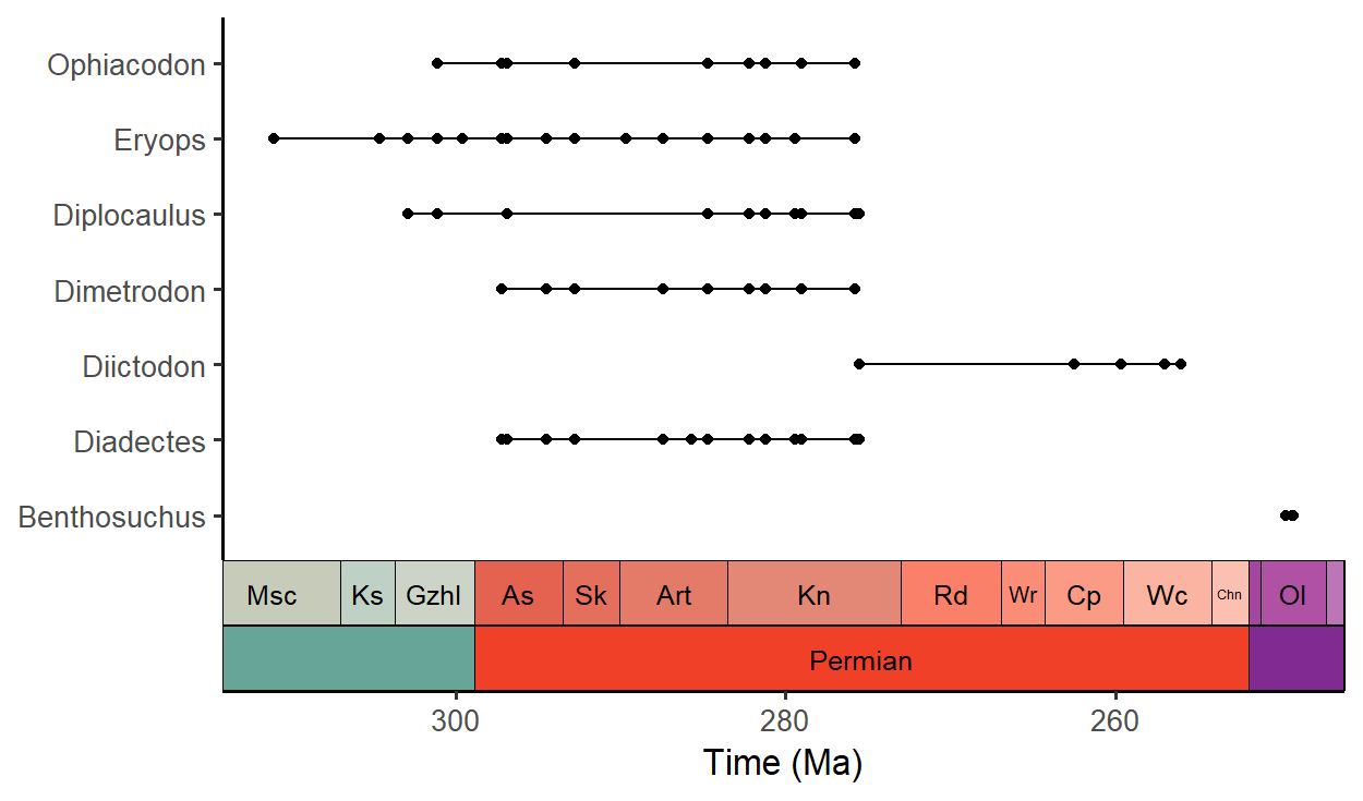 geom_points_range(aes(x = (max_ma + min_ma)/2, y = accepted_name)) +