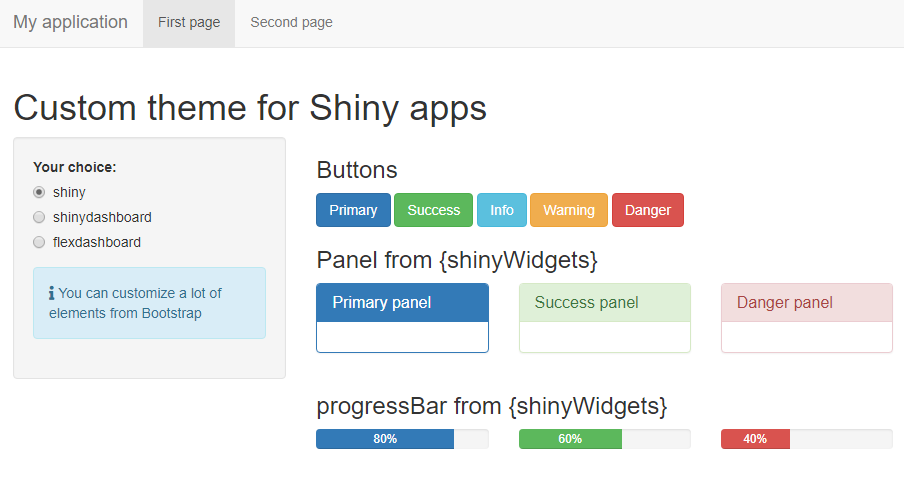 Create new themes to use in shiny applications with fluidPage or navbarPage. From the default theme :