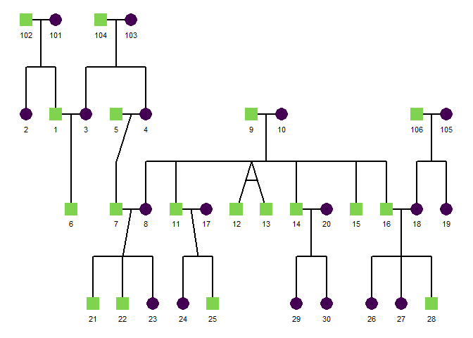 ggpedigree provides modern tools for visualizing family trees and pedigree structures using both ggplot2 and plotly. Specifically, it enables the creation of static and interactive pedigree plots that can accommodate complex family relationships, including duplicated individuals and various mating structures.