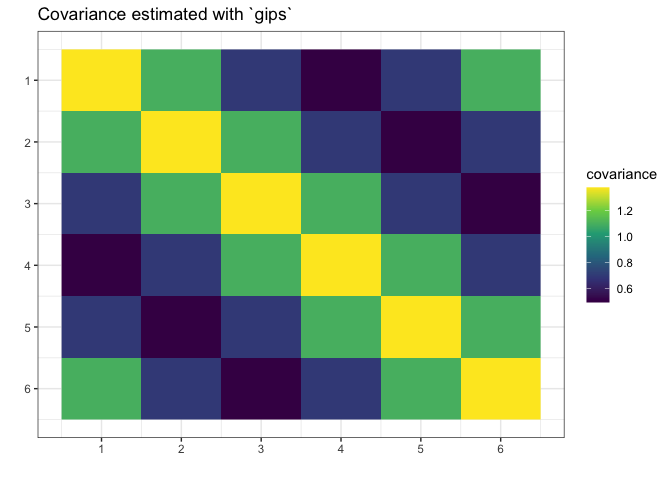 plot(g_map, type = "heatmap") + ggplot2::ggtitle("Covariance estimated with `gips`")