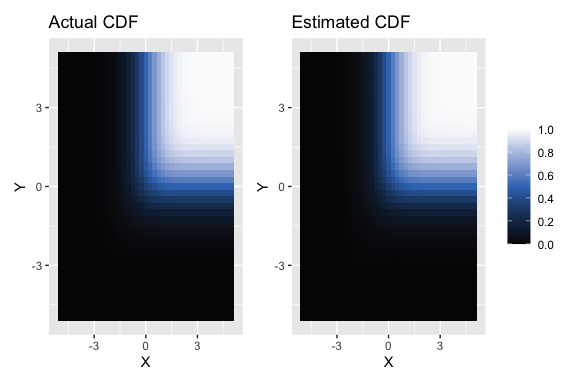 {r eval=FALSE} # Visualize Results for CDF (Not run, requires gganimate, gifski and transformr # packages) p <- ggplot(res,aes(x=x)) + geom_line(aes(y=cdf_est_vals, colour="Estimated")) + geom_line(aes(y=actual_cdf_vals, colour="Actual")) + scale_colour_manual("", breaks = c("Estimated", "Actual"), values = c("blue", "black")) + ylab("Cumulative Probability") + transition_states(idx_vals, transition_length = 2,state_length = 1) + ggtitle('Observation index {closest_state}') anim_save("cdf.gif", p)