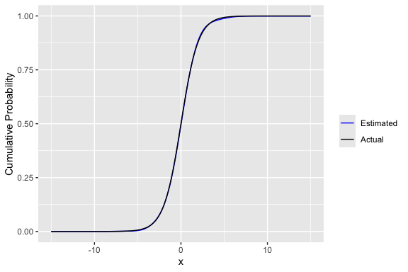ggplot(df_pdf_cdf,aes(x=x)) + geom_line(aes(y=cdf_est, colour="Estimated")) +