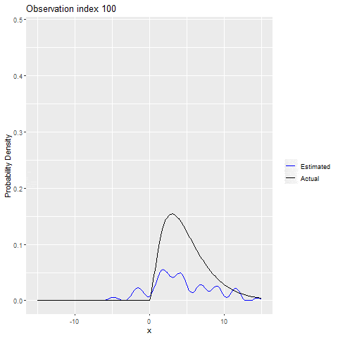 {r eval=FALSE} # Visualize Results for PDF (Not run, requires gganimate, gifski and transformr # packages) p <- ggplot(res,aes(x=x)) + geom_line(aes(y=pdf_est_vals, colour="Estimated")) + geom_line(aes(y=actual_pdf_vals, colour="Actual")) + scale_colour_manual("", breaks = c("Estimated", "Actual"), values = c("blue", "black")) + ylab("Probability Density") + transition_states(idx_vals,transition_length = 2,state_length = 1) + ggtitle('Observation index {closest_state}') anim_save("pdf.gif",p)