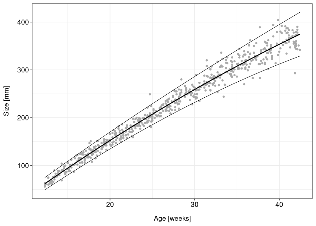 remotes::install_github("hriebl/lmls")The lmls package comes with the abdom dataset (which it borrows from the gamlss.data package). The dataset consists of only two variables: the size of 610 fetuses (as measurements of their abdominal circumference taken from ultrasound scans) and their gestational age ranging from 12 to 42 weeks.