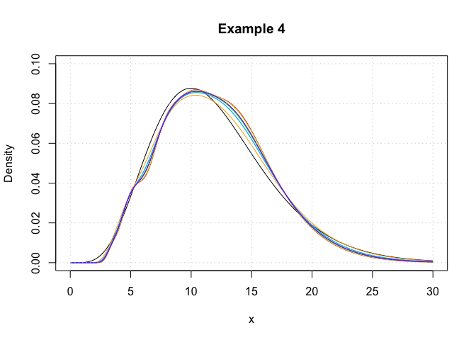 plot(c(0,30),c(0,0.1),type='n',xlab='x',ylab='Density',main='Example 4')
