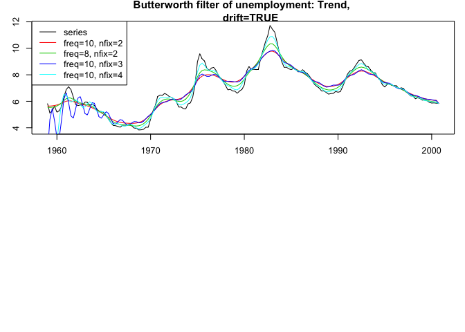 main="Butterworth filter of unemployment: Cycle,drift=TRUE",