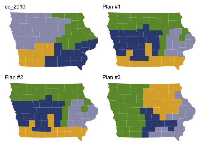 redist.plot.plans(iowa_plans, draws=c("cd_2010", "1", "2", "3"), shp=iowa_map)