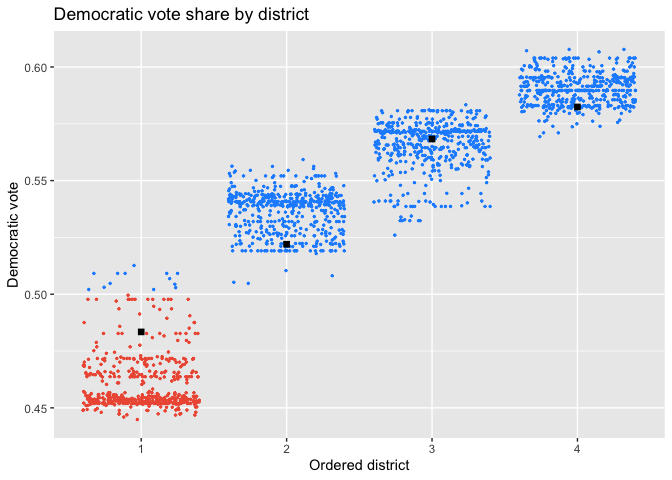 After generating plans, you can use redist’s plotting functions to study the geographic and partisan characteristics of the simulated ensemble.