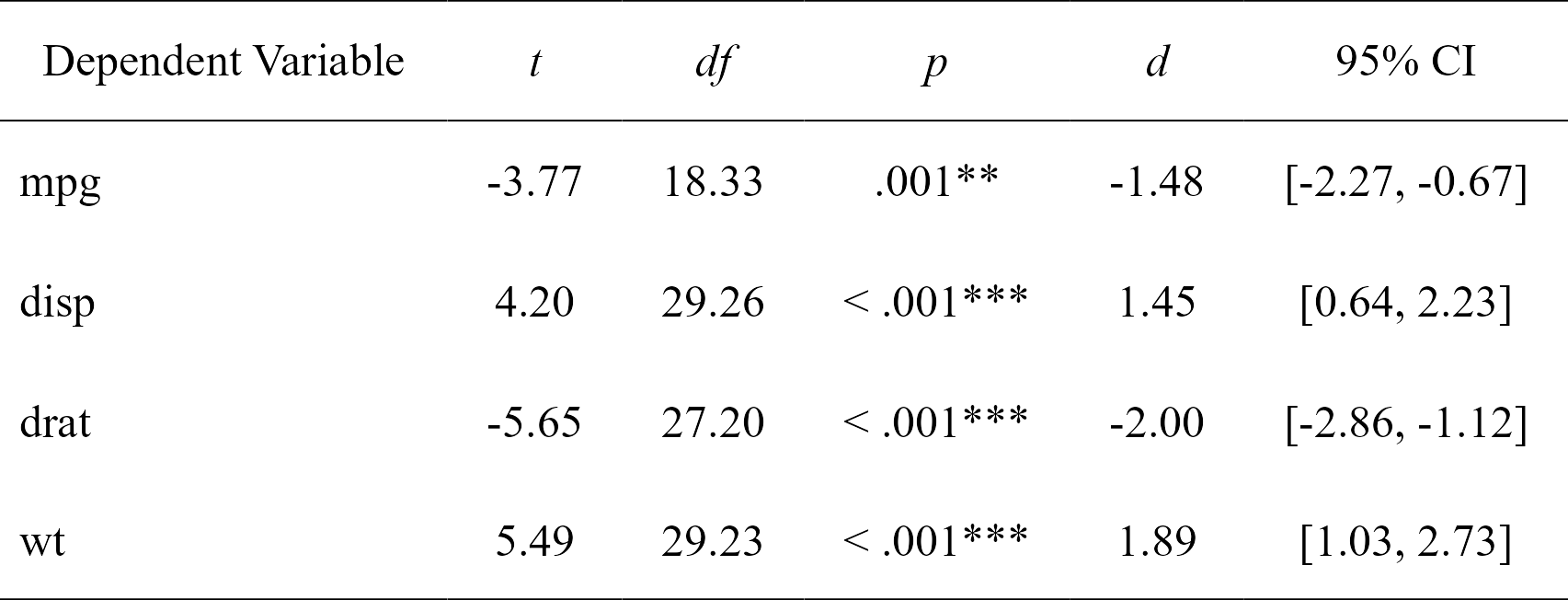 flextable::save_as_docx(t_table, path = "D:/R treasures/t_tests.docx")Full tutorial: https://rempsyc.remi-theriault.com/articles/t-test