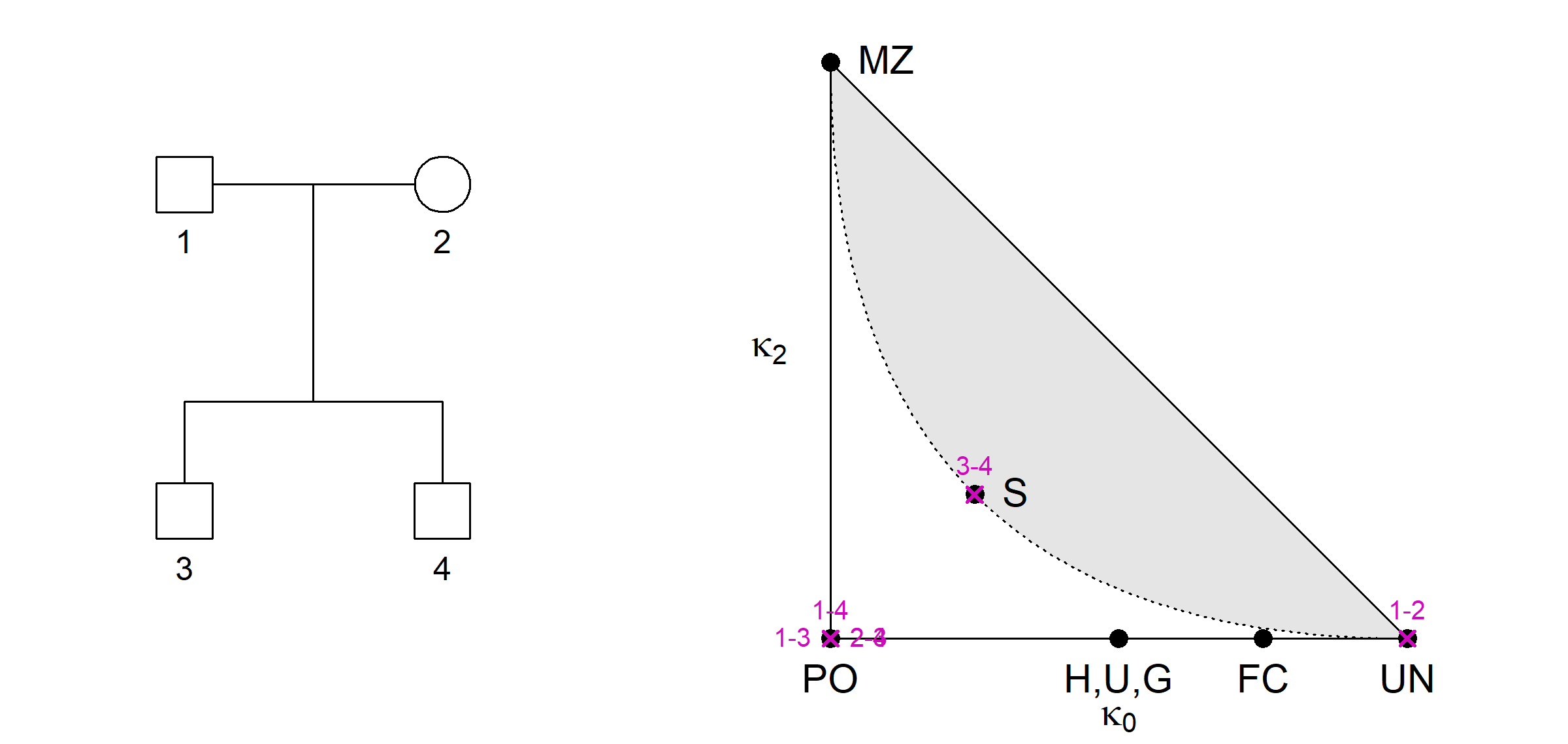 As shown by Thompson (1976), all relationships of noninbred individuals satisfy a certain quadratic inequality in the kappa’s, resulting in an unattainable region of the triangle (shown in grey above).