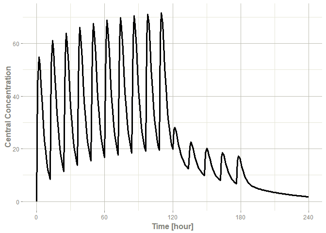 Note that the labels are automatically labeled with the units from the initial event table. rxode2 extracts units to label the plot (if they are present).
