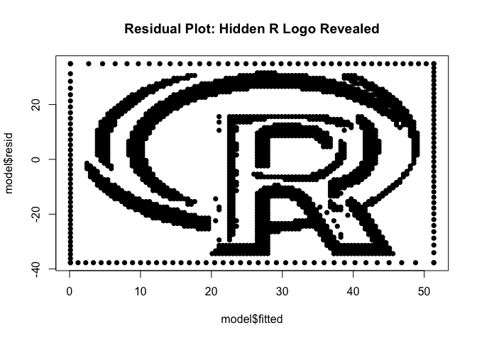The residual plot reveals the original R logo with a slight border. This border is automatically added inside the surreal method to enhance the recovery of the hidden image in the residual plot.