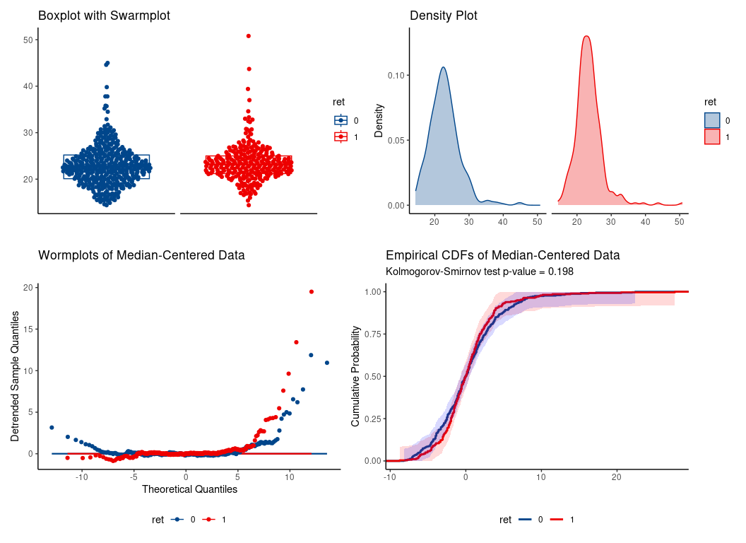 #> data: bmi by ret (n1 = 278, n2 = 391)